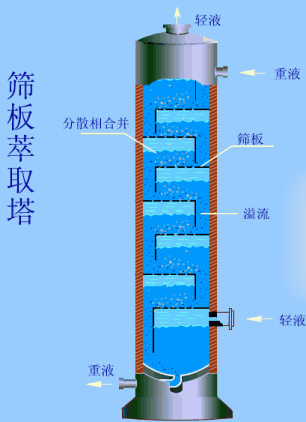 工作原理:往復(fù)篩板塔又稱振動(dòng)篩板塔。塔內(nèi)裝帶有許多塊篩板的往復(fù)振動(dòng)的中心軸的設(shè)備,中心軸通過塔頂?shù)尿?qū)動(dòng)裝置帶動(dòng)板串在塔中做垂直方向的往復(fù)運(yùn)動(dòng),從而對(duì)塔內(nèi)逆流流動(dòng)的兩液相起攪拌和分散作用。板串往復(fù)運(yùn)動(dòng)的振幅、頻率可以調(diào)節(jié),由于往復(fù)篩板塔具有處理量大、效率高、操作彈性大和結(jié)構(gòu)簡(jiǎn)單等優(yōu)點(diǎn)而廣泛運(yùn)用在制藥、石油化工、濕法冶金和廢水處理等工業(yè)部門。